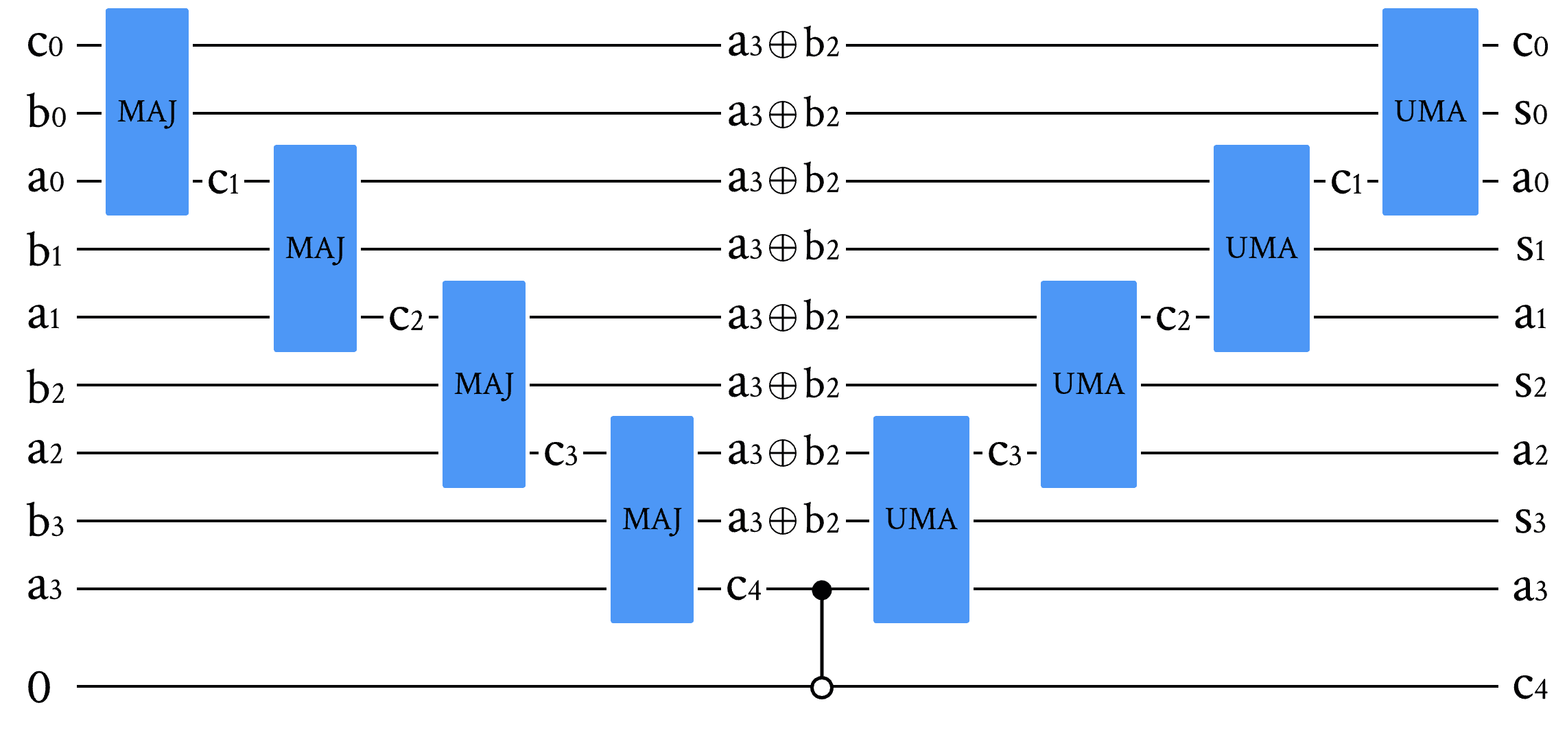 最后,已知 \((a_i + b_i) \mod 2\)(即来自MAJ模块的输出),通过使用CNOT门将其与 \(c_i\) 进行模2加法,从而得到 \(s_i = (a_i + b_i + c_i) \mod 2\)。