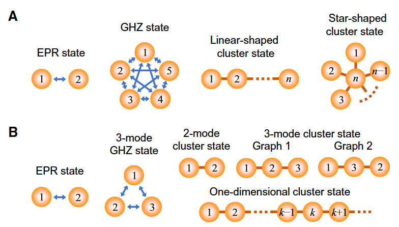 单模线路的时域复用线路结构如上图,核心模块是可调分束器+延时线圈+可调移相器结构,初始状态下延时线中是真空态,分束器角度设为\(\frac{\pi}{2}\),输入的压缩态经过可调分束器和延时线圈中的真空态形成置换,第一次输出真空态。 然后延时线圈中变为压缩态,第二次输入时域束器角度设为特定值(比如\(\frac{\pi}{4}\)),将两个压缩态纠缠起来,然后其中的一部分通过Homodyne测量探测输出,另一部分继续通过延时线圈和下一个输入的压缩态形成干涉(或者置换),然后部分纠缠态继续输出,如此往复。 通过设计可调分束器和可调移相器角度周期性变化,以及变化周期匹配输入光源频率,可以制备出多种形式的一维纠缠态,比如EPR态,GHZ态,星状纠缠态等等(见下图)。