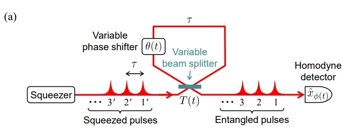 分束器周期性变化角度为\(\frac{\pi}{2},\frac{\pi}{4}\), 旋转门对应的周期性变化角度为\(\frac{\pi}{2}, 0\)。第一个\(X\)压缩态输入通过\(\frac{\pi}{2}\)的分束器置换出真空态, 然后通过\(\frac{\pi}{2}\)旋转门变换成\(P\)压缩态。 第二个\(X\)压缩态输入通过\(1:1\)分束器和\(P\)压缩态形成纠缠,然后其中一部分输出经过Homodyne 探测, 剩余部分和第三个\(X\)压缩态置换输出然后经过Homodyne探测。因此相邻两次输出的一定是EPR纠缠态, 相邻两次探测结果也是纠缠的。