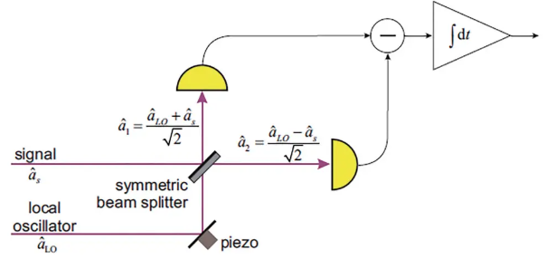 量子光学实验中可以测量光场量子态正交分量值的探测方法称为平衡零拍探测(Homodyne测量)[1]。其基本原理如下图所示,一束待测信号光场与一束同频的强本振光(LO)在 50/50 光学分束器合束,分束器之后的两束光分别进入两个相同的光电探测器,随后两个输出的光电流信号经减法器相减,输出的光电流信号正比于信号光场的正交分量值。 $\( i_{out}(t) \sim X_\theta(t) \)\( \)X_\theta = X cos\theta + P sin\theta\(, \)X, P\( 对应于算符\)\hat{x}, \hat{p}\( 的本征值,\)\theta$ 对应分束器的可调角度。
