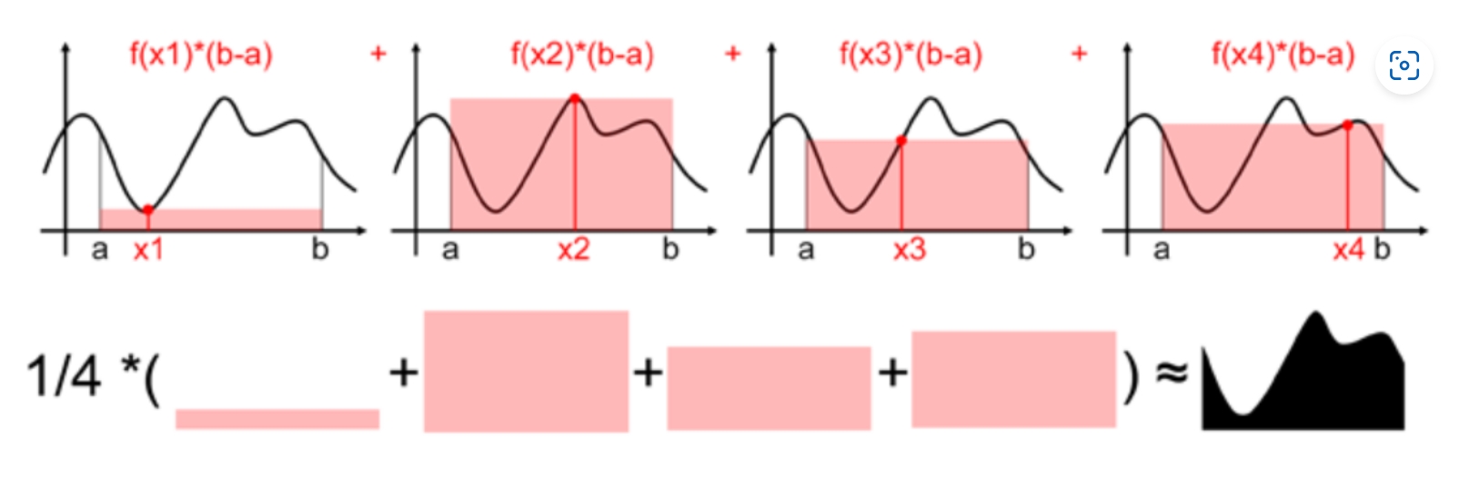 这里随机的点落在积分区域的概率正比于积分区域的面积, 因此红点所占的比例乘以矩形的面积就是函数 \( f(x) \) 的积分。