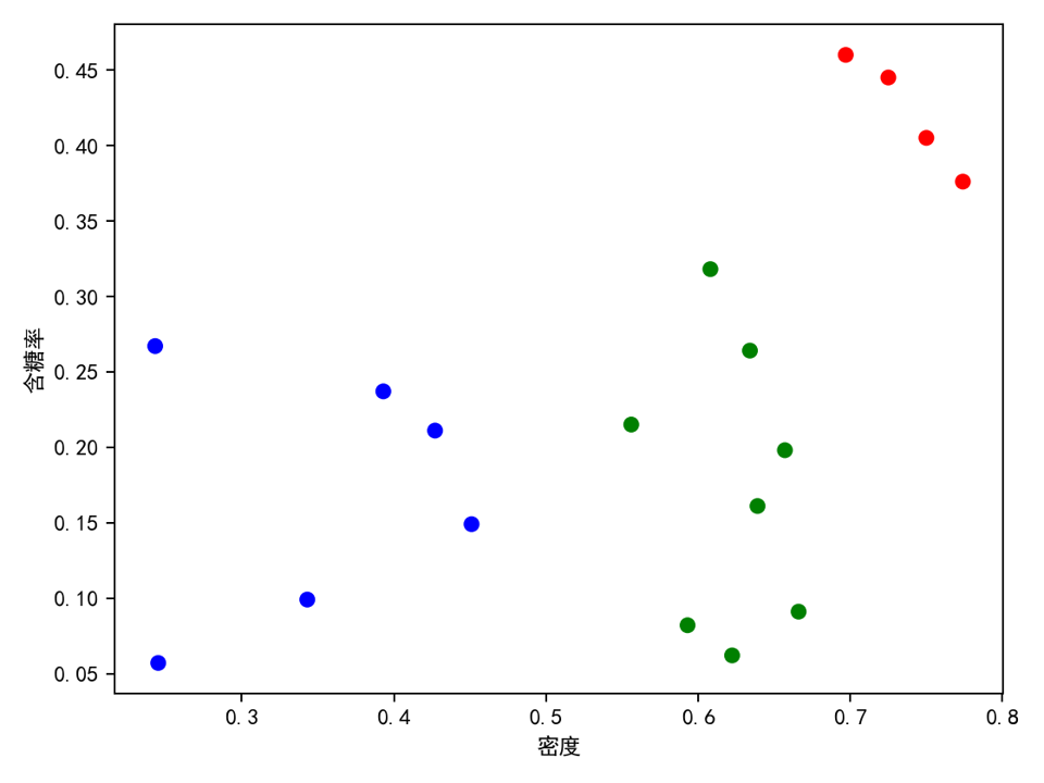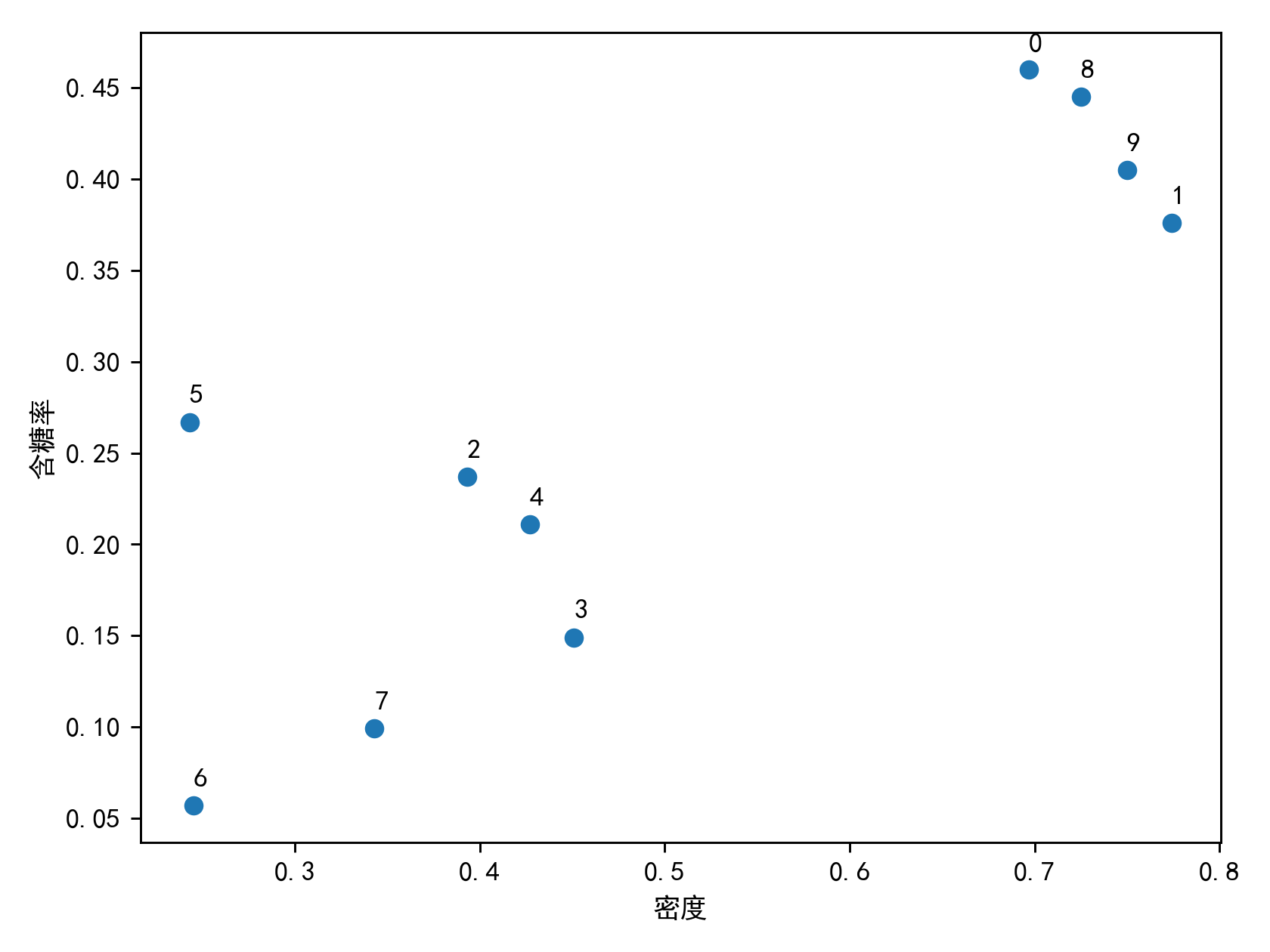 这里采用西瓜数据集进行聚类, 每一个数据点包含密度和含糖率两个特征, 分别对应data_ws第一行和第二行。