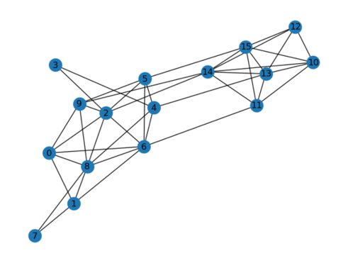 这里采用下图中16个节点的图作为例子,这个图可以看作是两部分子图组成,一部分是较为稀疏的子图,对应节点为0到9,另一部分是稠密的子图, 对应的节点为10到15。我们的目标是找到包含6个节点的稠密子图,即[10,11,12,13,14,15]组成的子图。