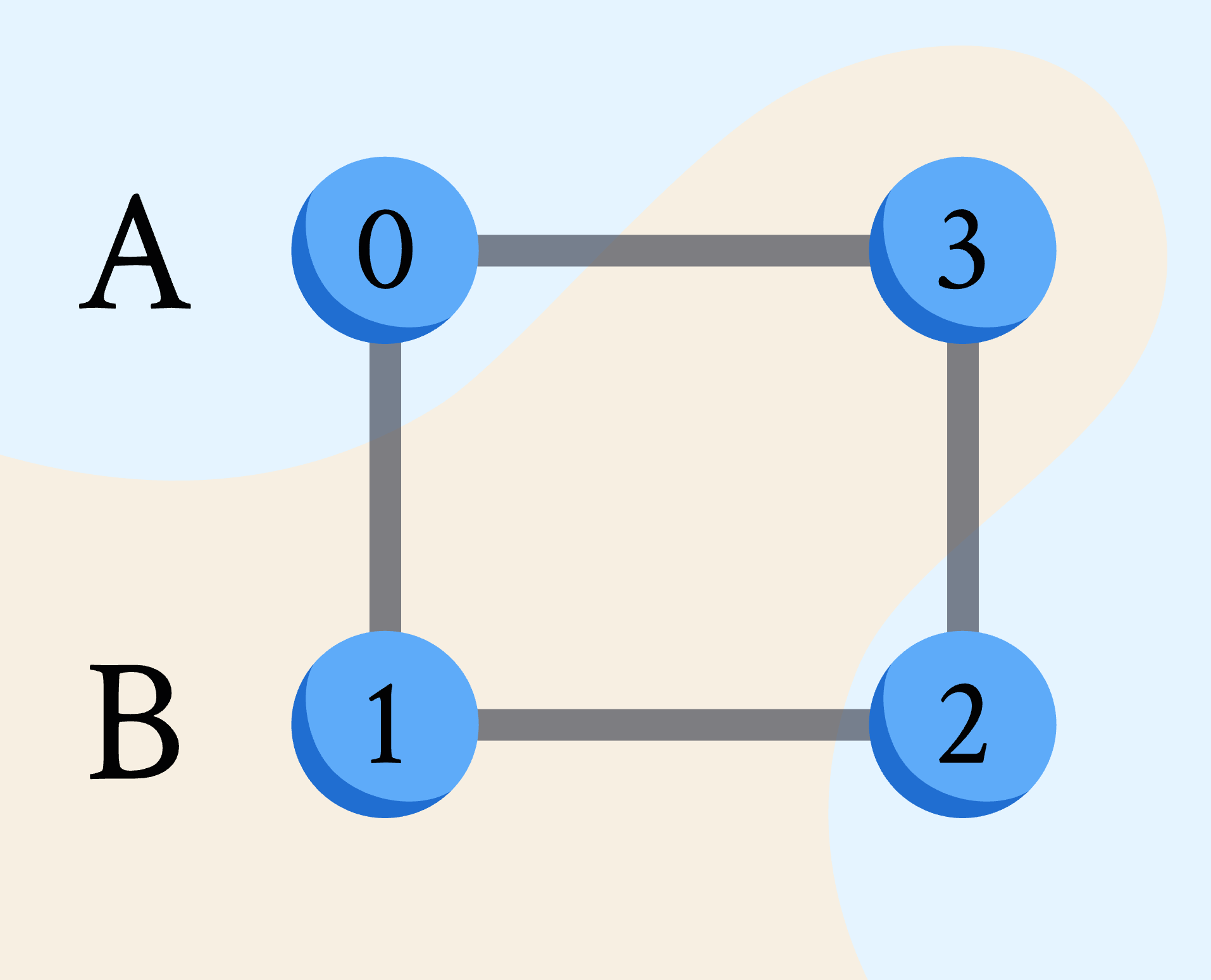 顶点到集合 \(A\) 或 \(B\) 的分配可以通过一个二进制字符串 \(z=z_1...z_n\) 来表示,其中 \(z_i=0\) 代表第 \(i\) 个顶点位于集合 \(A\) 内,而 \(z_i=1\) 则代表其位于集合 \(B\) 内。例如,在之前提到的图中,二进制字符串可以表示成 \(z=0101\),这意味着第 \(0\) 和第 \(2\) 个顶点位于集合 \(A\),而第 \(1\) 和第 \(3\) 个顶点位于集合 \(B\),这样的分配使得割断的边的数量 \(C\) 达到了4,这也恰好是该图的最大割。在后续的内容中,我们将探讨如何利用DeepQuantum来计算基态,从而找出这样的最大割配置。
