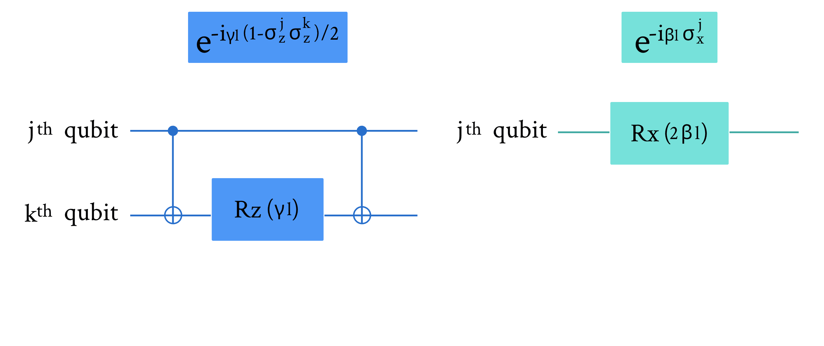 换言之,我们构建了 \(p\) 层参数化的 \(U_bU_C\) 门。它们可以用下图所示的量子门来实现,忽略一个与参数无关的常数项。