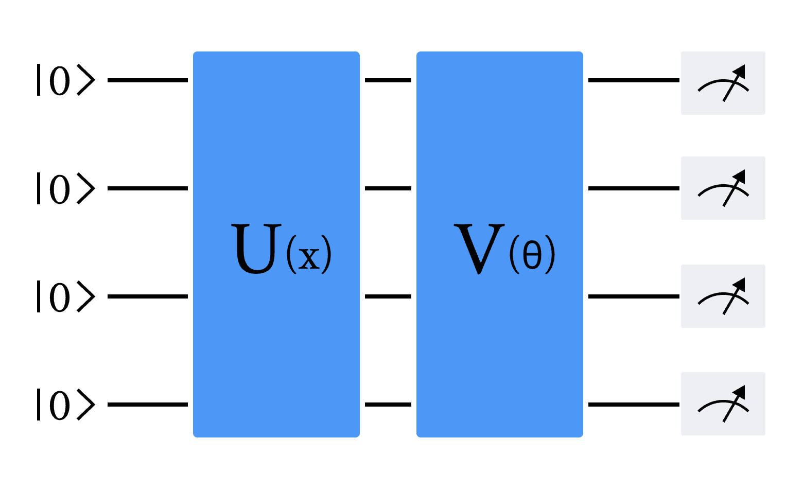 图 1 变分量子线路(VQC)的通用架构。U(x) 编码经典输入数据 x,V(θ) 是变分线路。线路最后是对部分或全部量子比特的测量