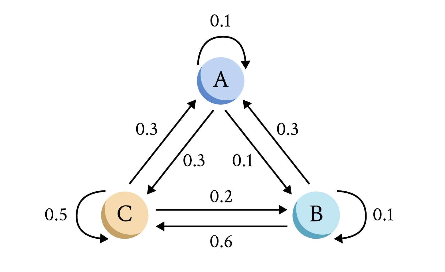 马尔可夫链是一种随机过程,通常用于对现实生活中的过程进行建模。它由状态和相关的转移概率组成,转移概率描述了在每个时间步长内在状态之间移动的概率。在我们这里使用的离散时间马尔可夫链中,时间步长是离散的。马尔可夫链满足马尔可夫性质,这意味着过程的下一步只取决于当前步骤,而不取决于之前的任何步骤。马尔可夫链有一个相关的转移矩阵P,描述了在每个状态之间移动的概率。下面我们展示了一个马尔可夫链及其相关转移矩阵P的示例。