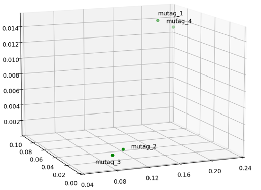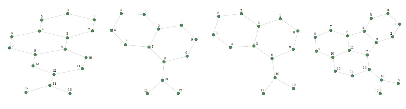 这里我们使用mutag数据集的前四个图来作为例子,如下图所示,下图中第一个和第四个图是相似的, 第二个和第三个图是同构的, 我们将通过高斯玻色采样实现四个图的分类。其他数据可以在这里找到