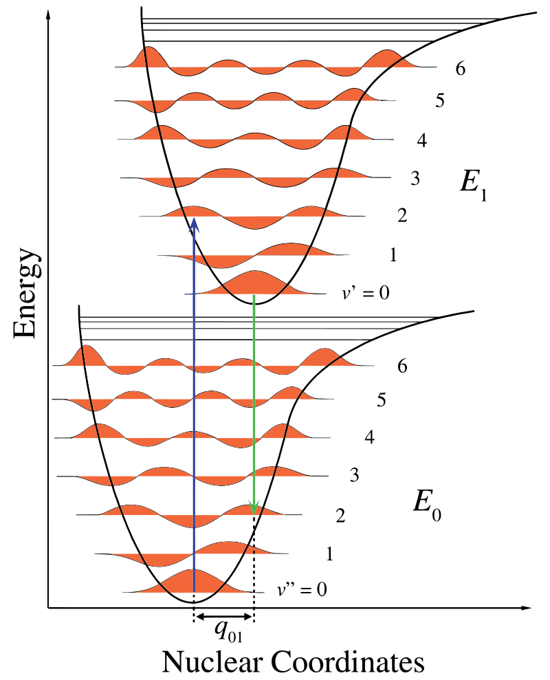 如果假设核和电子状态是独立的,对于极其复杂的分子系统,一个很好的近似称为玻恩-奥本海默近似。 由于原子核的质量较大,其对电子壳层变化反应更慢,因此在 Franck-Condon 原理中可以将原子核视为恒定。