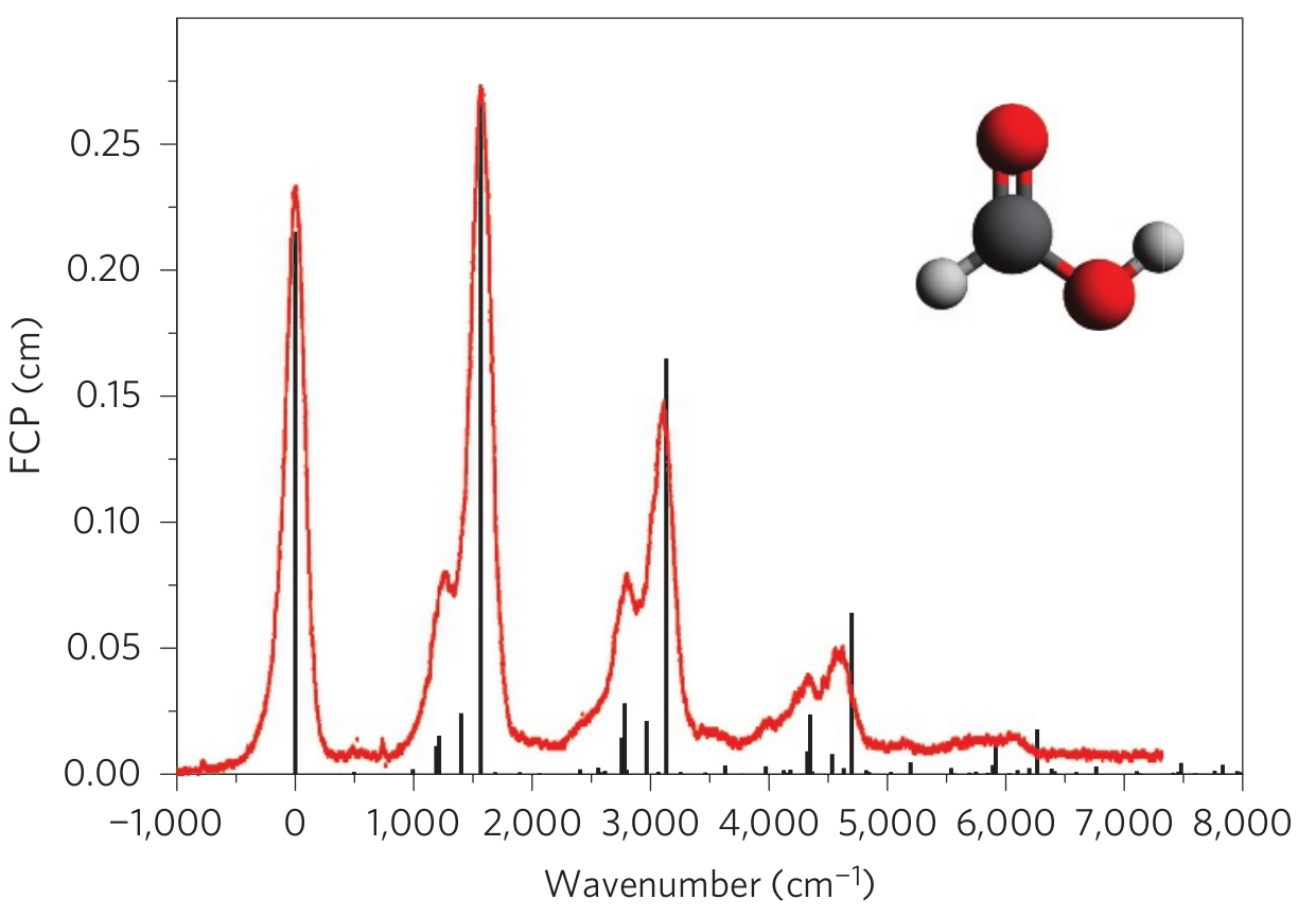Jankowiak的补充材料提供了一些分子的相关数据。 我们以甲酸(\(1^{1}A'\rightarrow1^{2}A'\))为例计算分子振动光谱: