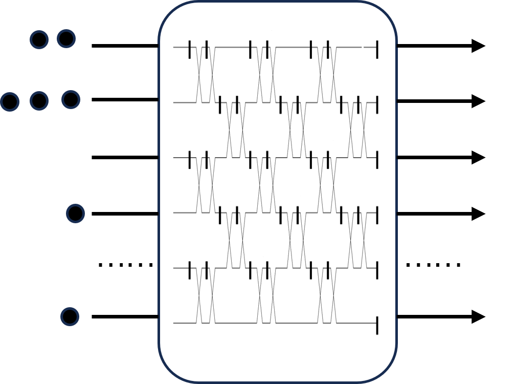 玻色采样由Aaronson和Arkhipov引入[1],它描述了这样一个物理过程:多个全同的单光子通过线性光学器件组成的多模光量子线路相互干涉后, 通过多次采样可以得到输出端口对应的概率分布,如下图所示。