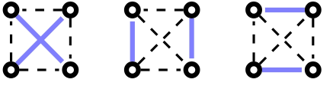 在图论中,hafnian计算了图 \(G\) 对应的邻接矩阵A描述的图的完美匹配数(这里图 \(G\) 是无权重,无环的无向图),比如邻接矩阵 \(A =\begin{pmatrix} 0&1&1&1\\ 1&0&1&1\\ 1&1&0&1\\ 1&1&1&0 \end{pmatrix}\),haf(A)=3,对应的完美匹配图如下。